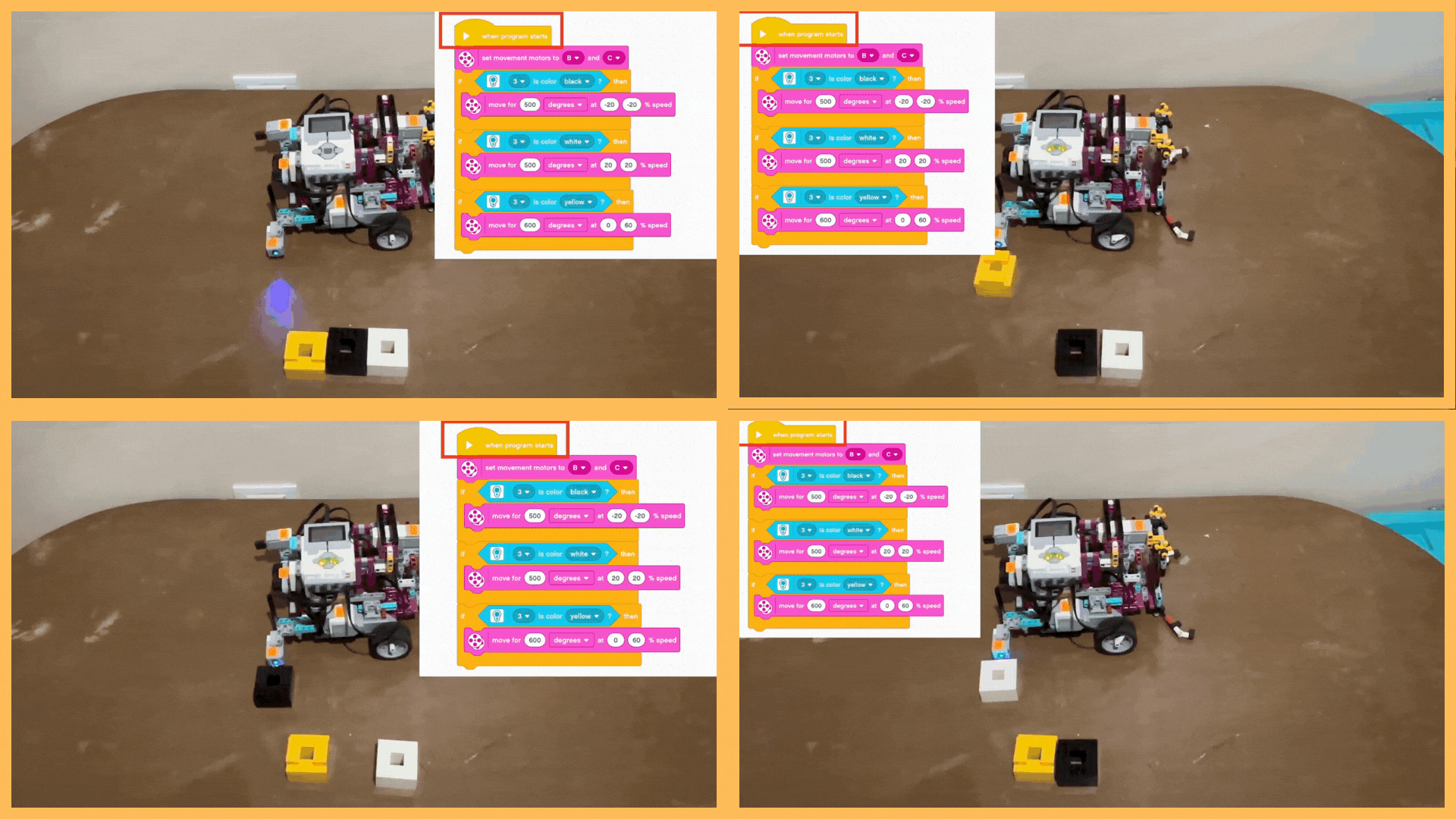 3- IF[reads yellow] THEN[Make a pivot turn of 600 degrees at the speed of 20].